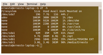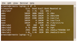 Nos desplegara una tabla donde nos indicara los siguientes campos: filesystem (sistemas de archivos, disco duro o partición) aquí nos dirá en que punto están montado nuestros discos y que partición estan siendo usadas determinada por un numero que esta luego de la partición es decir si tengo /boot montada en mi disco principal seria: /dev/sda1 donde 1 indica que es la primera partición de mi disco en sda; luego esta size que indica la capacidad o tamaño del disco, used indica cuanto espacio ha sido usado, avail indica cuanto espacio queda disponible, use% nos dice que porcentaje de espacio ha sido utilizado, mounted on indica en que carpeta esta montado el disco.