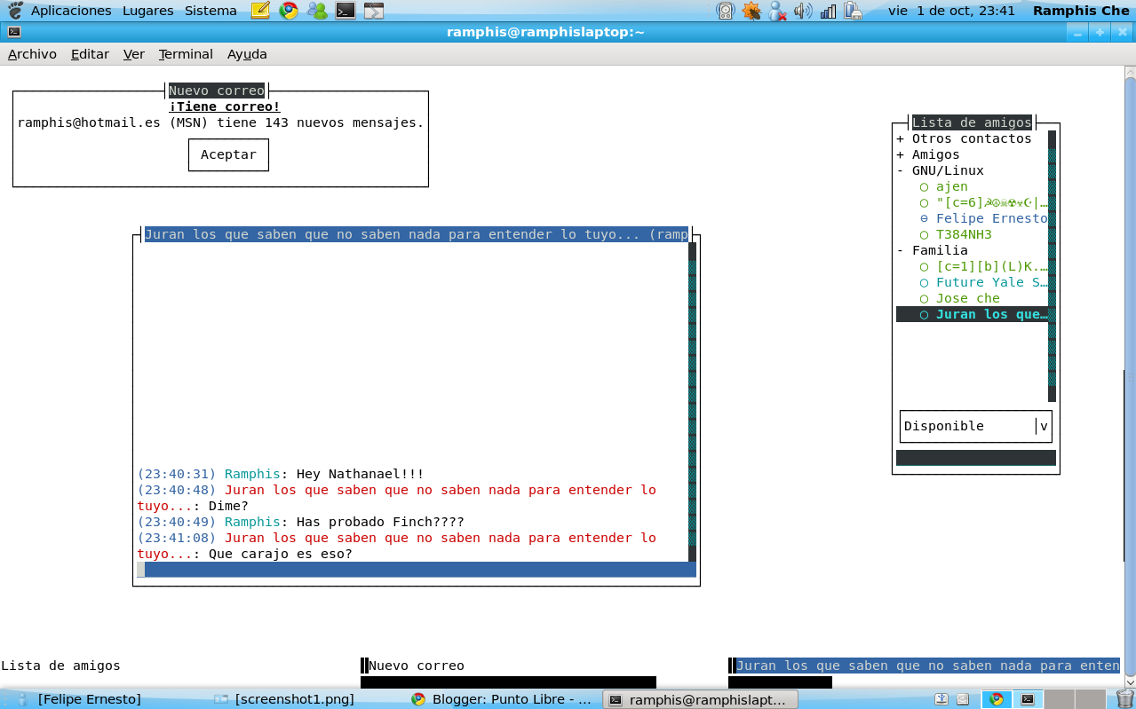 Finch es una versión de Pidgin desarrollada para Consola, para algunos no tendrá mucha utilidad, pero se que para algunos esto sera fantastico, por ejemplo yo lo uso para comunicarme con mis amistades en casos de emergencia desde el trabajo, en el cual me tienen bloqueado la mensajeria instantenea, me conecto a mi servidor en casa, y ejecuto el cliente Finch.
