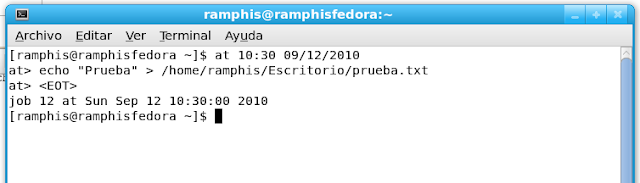 Luego at espera a que escribas los comandos, escribirás un comando y luego le darás a enter, cuando tengas todos los comandos, le damos a Ctrl + D, y estos comandos se ejecutaran a las 10:30, como no especifique fecha, se ejecutaran el día actual, y si la maquina se apaga antes de la hora programada, se ejecutaran al otro día, hasta que se cumpla la hora, al menos que no especifiquemos la fecha.